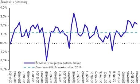 Overordnet har detailsalget været ganske pænt stigende gennem 2018, og med væksten i september er det nuværende niveau for detailsalget 2 pct. højere end for et år siden. Udviklingen trækkes af solide privatøkonomiske forudsætninger. Beskæftigelsen er steget 65 måneder i streg og er nu rekordhøjt, vores boliger er steget i værdi, vores lønninger stiger mere end priserne i butikkerne og renterne er fortsat på et meget lavt niveau. Alt det er med til at give luft i de danske husholdningsbudgetter og dermed plads til øget forbrug.