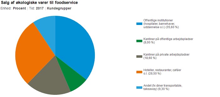 Danmarks Statistik offentliggjorde i slutningen af september tal for det økologiske salg til foodservice i 2017. Foodservice kategorien omfatter servering af mad fra køkkener i institutioner, restauranter, kantiner, caféer, udbringning mv. Statistikken vedrører udelukkende økologiske fødevarer.