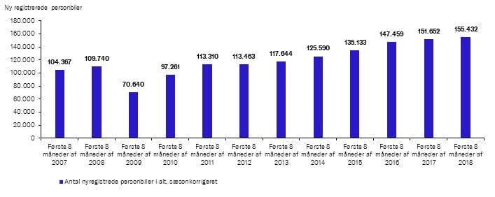 I løbet af årets første otte måneder blev der solgt 155.400 nye biler. Det er 3.800 biler flere end samme periode sidste år – svarende til 2,5 pct. Det er de bedste første 8 måneder, bilsalget nogensinde har haft herhjemme. Bilsalgets 8 første måneder peger i retning af at vi får rekord højt bilsalg i år. Der er også mange familier, der i øjeblikket har gode privatøkonomiske forudsætninger for at købe ny bil. Beskæftigelsen er rekord høj, ledigheden er lav samtidig er der pæn reallønsfremgang herhjemme.