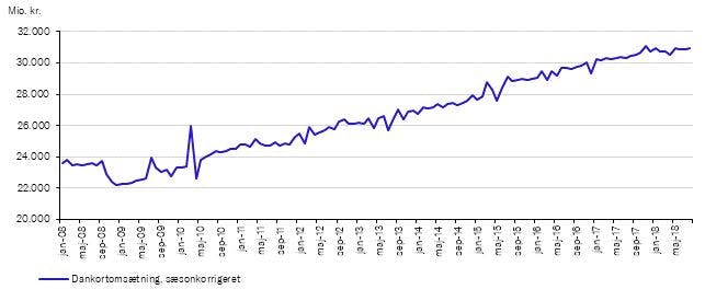 Nets har offentliggjort forbruget med dankort i august. Tallene viste at forbruget i august var knap 31 mia. kr., når man tager højde for sæsonudsving (Dansk Erhverv har sæsonkorrigeret tidsserien). Det er 0,4 pct. højere end i juli.