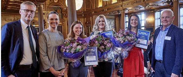 Fra venstre: Laurits Rønn, Direktør i Dansk Erhverv, Merete Riisager, undervisningsminister, 1. præmie Camilla Groth Pejtersen, 2 præmie Karoline Møller Jeppesen, 3 præmie Lena Munk og Per Tønnesen formand HK Handel.