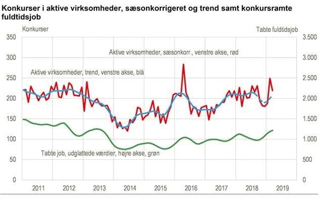 Vi har generelt i løbet af de senere år oplevet, at flere aktive virksomheder går konkurs. Det er umiddelbart overraskende set i lyset af, at de senere år har været præget af fremgang i dansk og global økonomi, som giver et godt grundlag for vækst hos mange virksomheder. Når der er fremgang i dansk og global økonomi, giver det samtidig mange med en iværksætter gemt i maven mere mod på at starte egen virksomhed. Det har vi også set i Danmark, hvor vi aldrig har set så mange nye virksomheder, som vi ser i disse år. Det er en af forklaringerne på, at vi ser flere konkurser i disse år end vi ellers umiddelbart forventede.