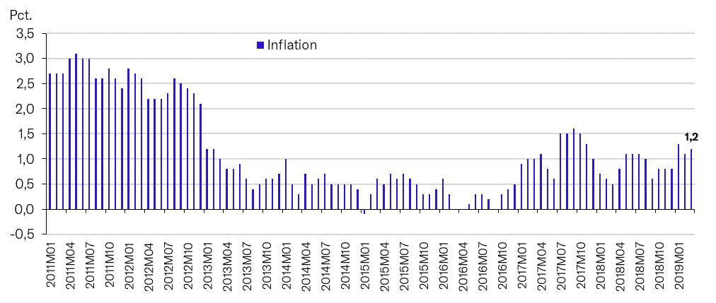 Set i et historisk perspektiv er en inflation på 1,2 pct. lavt, men i løbet af de seneste år har inflationen i Danmark været lav, og så sent som i september sidste år var inflationen nede og vende på blot 0,6 pct. Vi har i løbet af de seneste år oplevet pæn økonomisk fremgang herhjemme og i Europa. Normalt ville et opsving give et opadgående pres på priserne, men inflationen har været lav i både Danmark og resten af Europa. I de tre første måneder af 2019 har inflationen kommet op over 1 pct. Det tyder derfor på, at vi i 2019 igen skal til at vende os til lidt højere inflation. Trods lidt højere inflation i marts er den danske inflation fortsat i den laveste halvdel af EU-landene, og den danske inflation er fortsat lavere end gennemsnittet i eurozonen, der er på 1,4 pct. i marts måned.