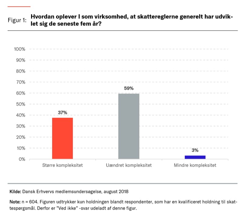 Ifølge Dansk Erhvervs medlemsvirksomheder er de danske skatteregler blevet sværere og sværere at forstå i løbet af de seneste år. Således angiver mere end hver tredje, at skattereglerne er blevet mere komplekse i løbet af de seneste fem år. Kun tre pct. har en opfattelse af, at skattereglerne er blevet mindre komplekse i løbet af denne periode. 59 pct. har ikke en oplevelse af, at kompleksiteten har ændret sig.