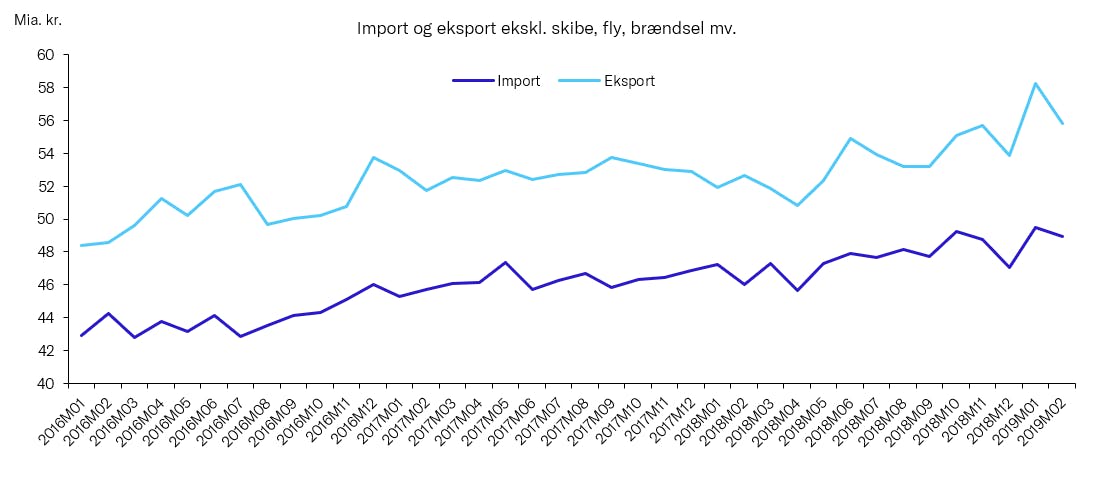 Det har været svært at finde en klar retning på vareeksporten det seneste år. Men efter fald i december startede 2019 fremragende ud med stigning på hele 8,1 pct. i januar, til det højeste niveau nogensinde. Men de nye tal for februar peger altså på at fremgangen i januar blot var en enkelt god måned. Når det er sagt er vareeksporten stadig på et højt niveau, og vareeksporten var i januar og februar hele 9,1 pct. højere end de tilsvarende måneder i 2018. Af den grund er der stadig tale om en pæn start på 2019 for vareeksporten.