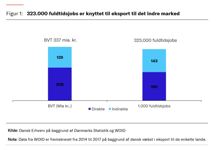 I Danmark er 180.000 fuldtidsjobs direkte knyttet til eksport af varer og tjenester til lande i det indre marked. Det kan eksempelvis være ansatte hos en dansk medicinalproducent, der afsætter medicin til lande i det indre marked. Desuden er 143.000 fuldtidsjobs i Danmark indirekte knyttet til eksport i det indre marked. Det kan eksempelvis være en dansk rengøringsvirksomhed, som udfører rengøring hos en dansk medicinalproducent, der eksporterer til det indre marked. Det betyder, at samlet er 323.000 fuldtidsjobs i Danmark enten direkte eller indirekte knyttet til eksport af varer og tjenester til lande i EU’s indre marked. Det svarer til mere end hver femte private fuldtidsjob i Danmark.