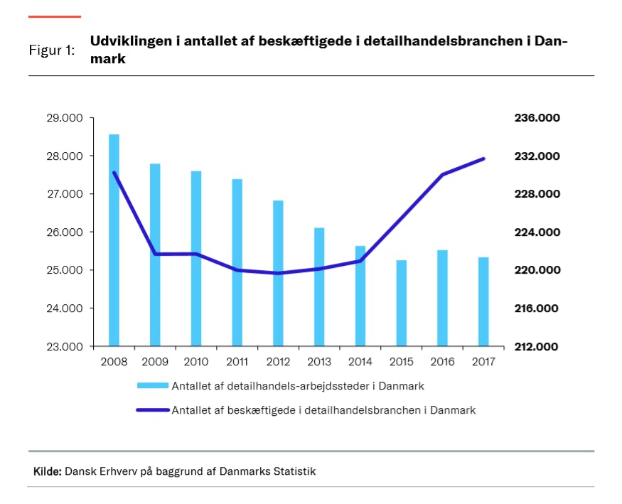 - På landsplan er der fra 2008 til 2017 forsvundet ca. 3.200 detail-arbejdssteder, men i samme periode er antallet af beskæftigede i detailhandlen vokset med 1.500 personer.