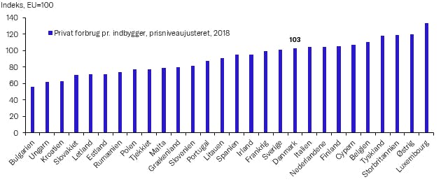 Trods de høje priser, har danskerne stadig gode forbrugsmuligheder. Det skyldes, at vi har et højt velstandsniveau. Danmark har det 4. højeste BNP pr. indbygger i EU, når man korrigerer for de høje priser, vi oplever herhjemme. Det er hele 28 pct. højere end gennemsnittet i EU. Når vi ser på danskernes private forbrug, så er vi placeret som nummer 10 blot 3 pct. højere end gennemsnittet i EU.