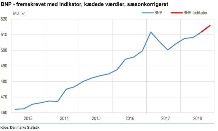 Danmarks Statistik har torsdag offentliggjort det første og med foreløbige bud på væksten i 4. kvartal sidste år – den såkaldte BNP-indikator. Dagens tal viser, at væksten i dansk økonomi blev 0,8 pct. i 4. kvartal. Den høje vækst i BNP-indikatoren skyldes især højere produktion i industrien og transportbranchen. Sammen med tal for 4. kvartal har vi det første og meget foreløbige bud på væksten i dansk økonomi i 2018, der endte på 1,1 pct. Det er væsentlig lavere vækst end de foregående tre år, hvor væksten hvert år har været på over 2 pct. Danmarks Statistik påpeger dog, at det skal tages med forbehold, fordi en ekstraordniær patentbetaling, der i øjeblikket er placeret i 2017, men som skal fordeles ud over flere år. Det er med til at holde væksten nede i 2018.