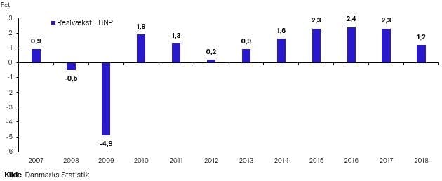 Dagens tal viser, at dansk økonomi slutter 2018 af med høj vækst i 4. kvartal på 0,7 pct. – det er en anelse lavere end BNP-indikatoren fra et par uger siden, der viste vækst på 0,8 pct. i 4. kvartal.