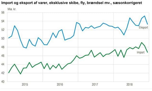 Danmarks Statistik har fredag offentliggjort tal for den danske vareeksport frem til og med november i år. Det har været svært at finde en klar retning på vareeksporten i 2018. Vareeksporten var faldende frem til sommeren, hvorefter vi oplevede pæne vækstrater.