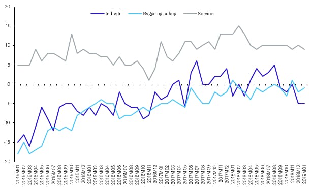 I januar var industriens konjunkturindikator uændret med nettotallet -5. Industriens konjunkturindikator er faldet betydeligt siden den toppede i august. Til gengæld faldt konjunkturindikatoren for serviceerhvervene, mens bygge og anlægs konjunkturindikator gik fra -2 til -1.