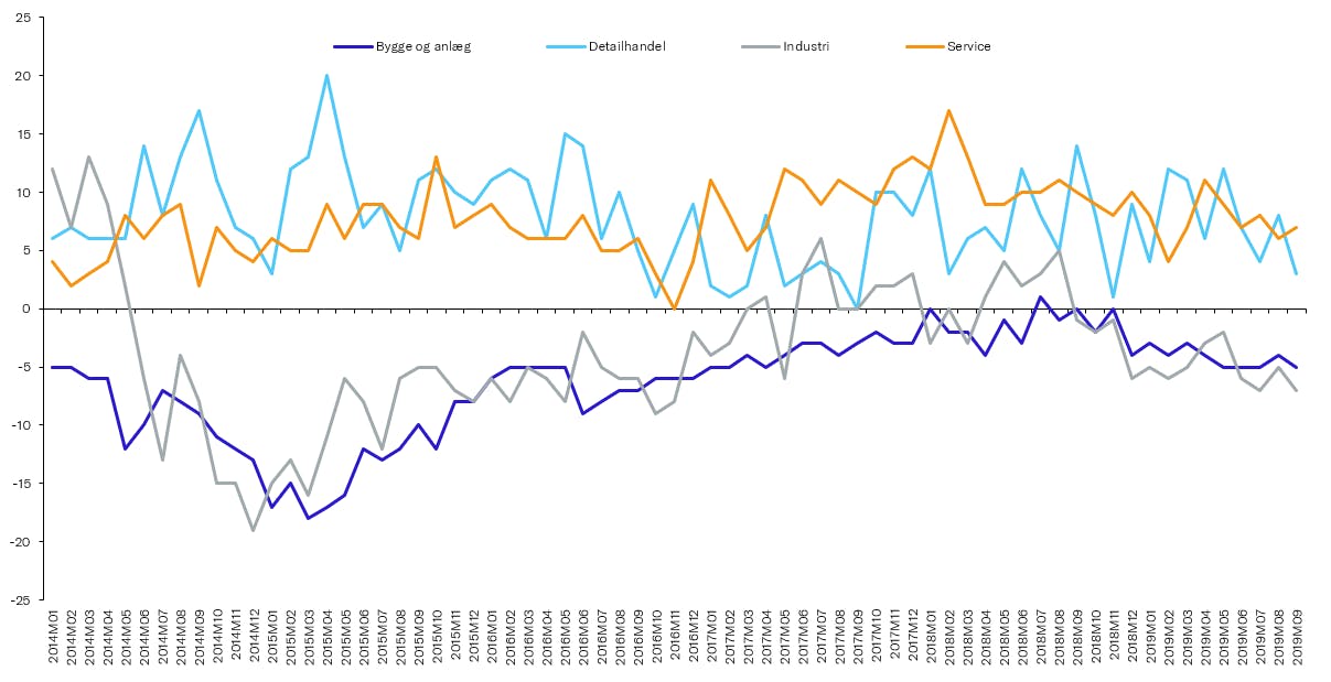 I december faldt industriens konjunkturindikator til nettotallet -5 – det er dermed fjerde måned i træk med fald. Faldet sker på baggrund af både fald i ordrebeholdningen og ophobede færdigvarelagre. Usikkerhed omkring handelskrig, Brexit samt svagere nøgletal for europæisk økonomi kan have spillet en rolle i, at vi har set industriens konjunkturindikator falde de senere måneder.