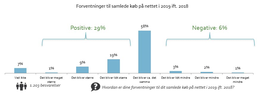 Der er grund til fortsat optimisme og tro på fremtiden for danske netbutikker. Forbrugerne ikke har planer om at skrue ned for forbruget i 2019. Tværtimod svarer hver tredje forbruger, at de forventer at handle mere på nettet i 2019. Blot 6 % svarer, at de vil købe mindre online.