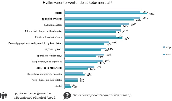 Netbutikker indenfor næsten alle varegrupper kan frem til et travlt år, men butikker, der sælger oplevelser, ser ud til at få ekstra travlt. Kategorien Rejser falder lidt, men til gengæld stiger kulturoplevelser og er kun overgået af Rejser og Tøj, sko og smykker.