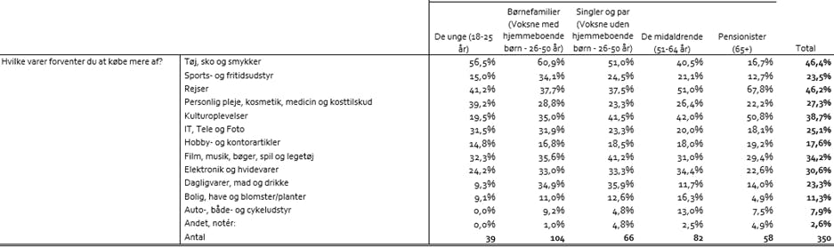 Analysen viser også, at der er forskel på, hvad de forskellige forbrugergrupper vil bruge penge på. De unge og børnefamilierne vil eksempelvis købe mere tøj, mens pensionisterne vil bruge mere på rejser.