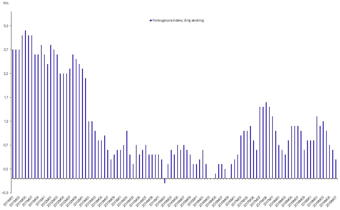 Siden inflationen var nede og ramme blot 0,6 pct. i september sidste år steg inflationen svagt frem til januar i år, hvor inflationen ramte 1,3 pct. Vi havde egentlig forventet, at inflationen ville fortsætte på det højere niveau fra januar, og måske endda stige en smule. Men siden er inflationen lige så stille dalet måned for måned til nu blot 0,7 pct. i maj. En inflation på 0,7 pct. er lavt set i et historisk perspektiv, men i de seneste seks år har inflationen været lav. Med de seneste års opsving i dansk og international økonomi skulle man egentlig forvente et opadgående pres på priserne, men både i Danmark og Europa har inflationen været overraskende lav. I løbet af de senere år har det særligt været priserne på varer, der har holdt den danske inflation nede, mens prisstigningerne på tjenester har været højere.