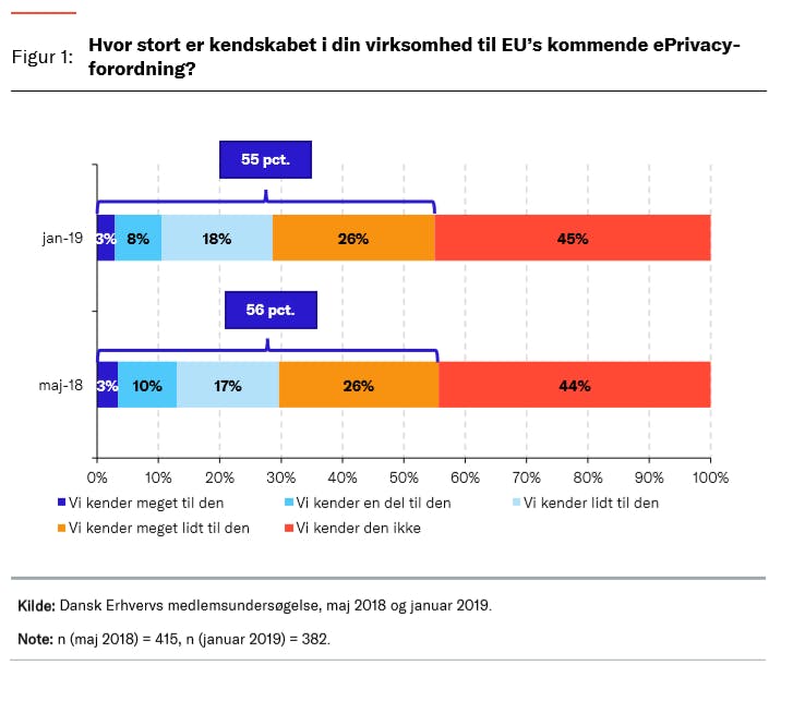 Selvom ePrivacy-forordningen efter EU-Kommissionens plan skulle have været klar og trådt i kraft samtidig med GDPR-reglerne, så er kendskabet til den omfattende forordning overraskende lavt blandt virksomhederne. Omkring halvdelen af Dansk Erhvervs medlemmer har aldrig hørt om forordningen, og kun 11 pct. af virksomhederne har et kvalificeret kendskab til elementerne i forordningen. Kun lige godt hver fjerde virksomhed forventer at blive berørt af den nye forordning.
