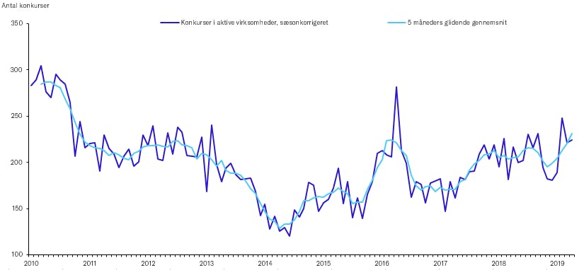 I løbet af årets første fire måneder har der været en stigning i antallet af konkurser på 3 pct. sammenlignet med de samme fire måneder sidste år. Samtidig har konkurserne i årets første fire måneder ledt til hele 8 pct. flere tabte fuldtidsjobs end de samme måneder sidste år. 2019 er startet dårligt for de mange virksomheder, der er gået konkurs, og som samtidig har medført, at mange personer har mistet deres job. Når det er sagt, så er der i øjeblikket gode forudsætninger for mange lønmodtagere til at finde et nyt job; måned efter måned sætter lønmodtagerbeskæftigelsen rekord, og vi forventer, at beskæftigelsen i Danmark krydser 3 mio. i år.