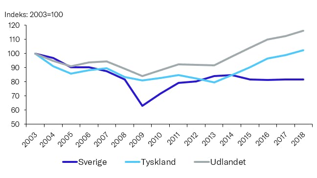 De svenske overnatninger i Danmark er faldet med 18 procent eller knap 410.000 over-natninger i perioden 2003-2018. I samme periode er de udenlandske overnatninger samlet steget med 3,8 millioner. Tilbagegangen fra Sverige til trods, så er Sverige dog stadig Danmarks næststørste marked målt på turismeomsætning (6.5 mia. kr.) og tred-jestørste marked målt på overnatninger (1.8 mio.) .