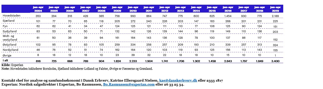 Der har i april 2019 været 971 konkurser. Det viser nye tal fra Experian. Det er en stigning på 116,7 pct. sammenlignet med april 2018, hvor der var 448 konkurser. I Hovedstaden, som har haft den største andel af konkurser i perioden, står IVS’er for hele 60 pct. af konkurserne.