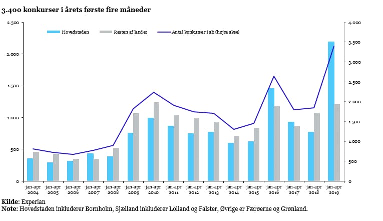 Antallet af konkurser i april er steget med 116,7 pct. i forhold til samme måned sidste år. Det viser spritnye tal fra data- og analysevirksomheden Experian. Det bringer det samlede antal af konkurser i 2019 op på 3.400. Til sammenligning gik 1.849 virksomheder konkurs i samme periode sidste år, hvilket svarer til en stigning på 84 pct. i år sammenlignet med sidste år.