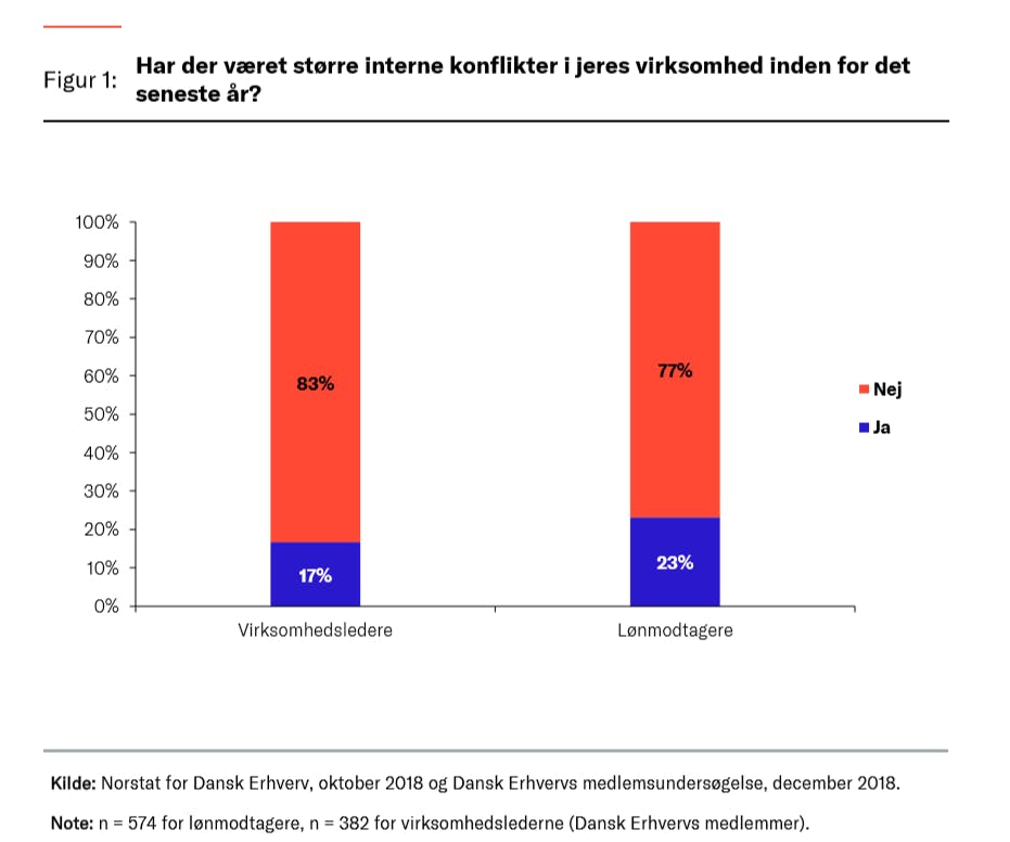 Uenigheder og forskelligheder er en naturlig del af livet, når forskellige mennesker mødes. Løses uenighederne imidlertid ikke konstruktivt, kan de udvikle sig til større konflikter. Dansk Erhverv har sat sig for at undersøge omfanget af større interne konflikter på de danske arbejdspladser. For at få så dækkende et billede som muligt, indgår svar fra både virksomhedsledere og lønmodtagere i det følgende. Virksomhedsledernes perspektiver stammer fra en medlemsundersøgelse, som Dansk Erhverv har foretaget blandt egne medlemmer, mens Norstat har indsamlet data for Dansk Erhverv blandt et repræsentativt udsnit af danske lønmodtagere for at afdække deres syn på sagen.