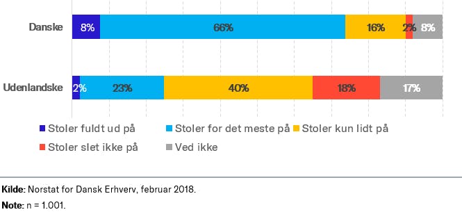Det gælder både når de køber på nettet og i fysiske butikker. 74 procent af forbrugerne svarer, at de stoler på, at de danske netbutikker overholder forbrugerreglerne. Deres tillid til de udenlandske netbutikker er markant lavere, her stoler kun hver fjerde på, at forbrugerreglerne vil blive overholdt.