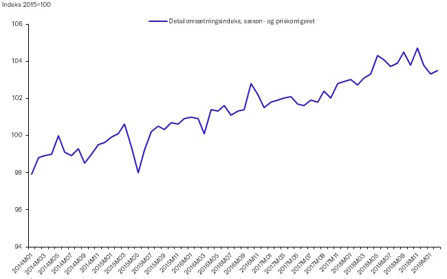 Trods fremgangen i februar er detailsalget i løbet af de seneste tre måneder (december-februar) 0,8 pct. lavere end de foregående tre måneder (september-november). Tilbagegangen er egentlig overraskende set i lyset af at der er gode forudsætninger for fremgang i det private forbrug: beskæftigelsen er rekordhøj, ledigheden er lav og reallønnen stiger pænt. Det giver lidt mere luft i budgetterne til at lade forbruget stige, men det ser vi ikke umiddelbart. En af forklaringerne på tilbagegangen i detailsalget er, at forbrugertilliden lige så stille er dalet siden toppen i juni sidste år, og er i dag på et lavere niveau end for et år siden.