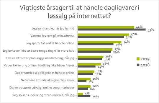 Den tredjedel, der køber dagligvarer online, fremhæver især bekvemmelighedsfaktorer som, at det sparer tid, og muligheden for at handle, når det passer i dagligdagen samt levering hjemme. Men der opleves også større udvalg online, og så er det fx nemmere at finde allergivenlige varer.