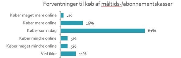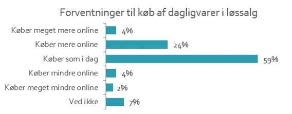 Trods de holdningsmæssige barrierer for at købe dagligvarer online, så stiger salget af dagligvarer på nettet, og det vil fortsætte i de kommende år. 6 ud af 10 kunder fortsætter med samme type køb i det kommende år, mens andelen af dem, der vil købe mere, lægger markant højere end dem, der vil skrue ned for onlinekøbet.