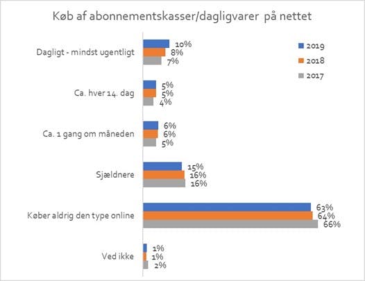 Hver 10. dansker køber dagligvarer online hver uge enten som løssalgskøb eller i form af en måltidskasse på abonnement. Det gør dagligvare-køberne til nogle af de mest mest aktive e-handelsforbrugere. Samlet udgør forbrugere, der køber dagligvarer online, en tredjedel af de danskere, som handler på nettet. Her er det især børnefamilierne, der er kunder i de digitale supermarkeder eller som købere af måltidskasser.
