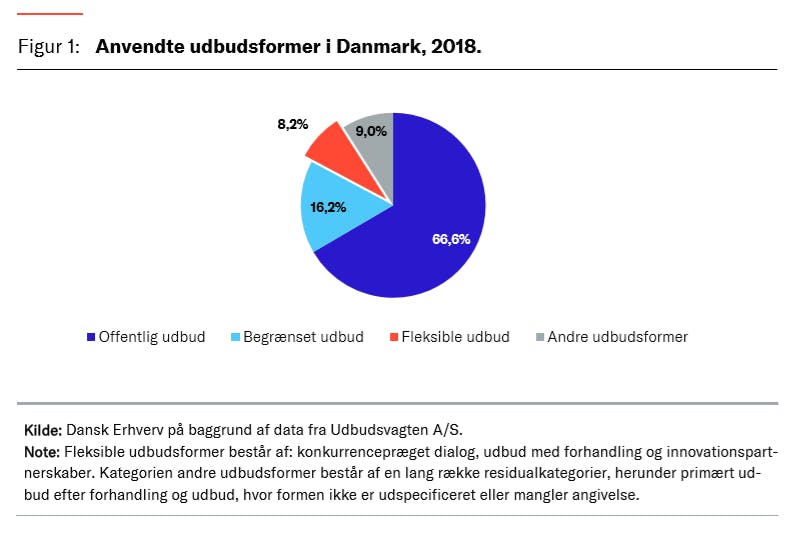 På baggrund af data fra Udbudsvagten har Dansk Erhverv analyseret udviklingen i brugen af de fleksible udbudsformer. I 2018 blev fleksible udbudsformer benyttet ved cirka hvert tolvte udbud (8,2 pct.) i den offentlige sektor. Det er en lille stigning fra 6,4 pct. i 2017. Alligevel er det stadig de traditionelle udbudsformer, offentligt udbud og begrænset udbud, som anvendes oftest, nemlig i godt fire ud af fem udbud i den offentlige sektor.