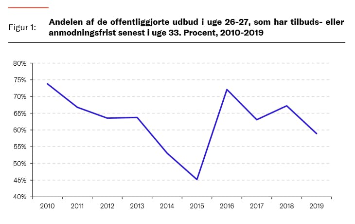 Fra 2010 til 2015 gik udviklingen ellers den rigtige vej og det offentlige planlagde flere sommerudbud med frister, der ikke lå i skolernes sommerferien. De nye beregninger fra 2019 tyder derfor på, at vi er på rette vej igen, hvilket også er vigtigt, da det kan skade konkurrencen og i sidste ende betyde, at det ikke er de mest velegnede virksomheder, som vinder opgaven, hvis tilbuds- eller anmodningsfristen ligger i sommerferien. Derfor kan det også være et problem for det offentlig-private samarbejde, og i sidste ende koste danske borgere skattekroner, hvis det offentlige ikke får løst opgaverne på den bedste og mest effektive måde. Dansk Erhverv ser derfor meget positivt på denne udvikling.