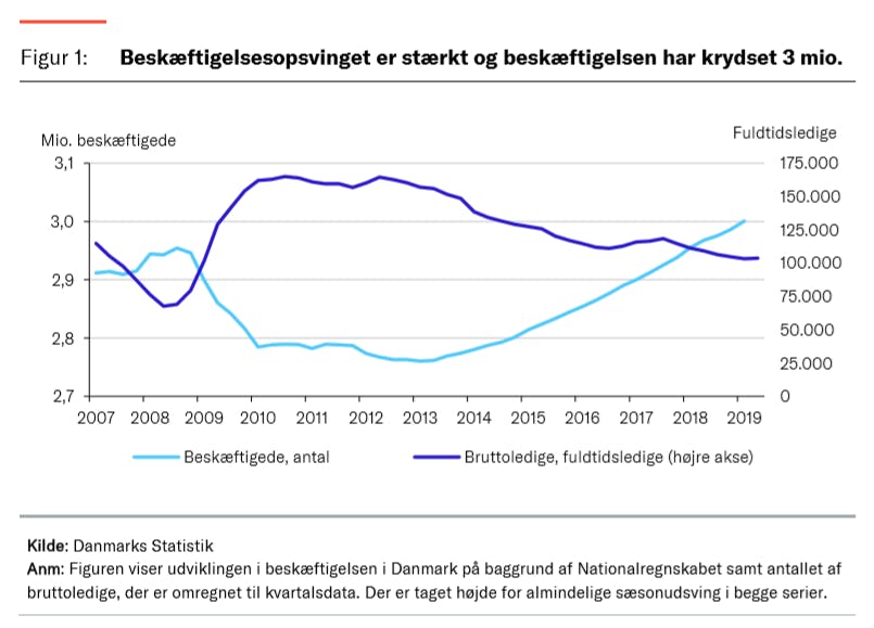 Det danske beskæftigelsesopsving har været stærkt i løbet af de senere år, og den danske lønmodtagerbeskæftigelse er steget uafbrudt i mere end 6 år. Det gør, at beskæftigelsen i Danmark for første gang nogensinde er krydset 3 millioner personer. Den kraftige jobvækst har gjort, at ledigheden også er faldet siden 2013, så antallet af ledige i dag udgør 3,8 pct. af arbejdsstyrken.