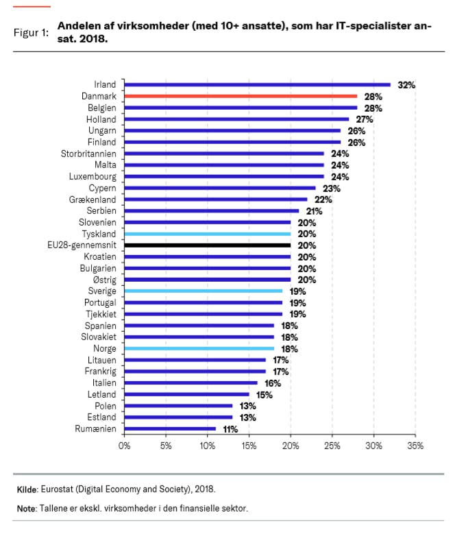 Mange danske virksomheder søger hver dag forgæves efter IT-specialister, og Erhvervsstyrelsen har tidligere vurderet, at vi på trods af øget optag på IT-uddannelserne kommer til at mangle 19.000 IT-medarbejdere frem mod 2030. Danmark er dog langt fra det eneste land i Europa, som mangler IT-specialister. I langt de fleste lande har mere end hver anden virksomhed, som har forsøgt at rekruttere IT-specialister, oplevet problemer med at finde den rette kandidat til jobbet. Det er derfor ikke sandsynligt, at vi kan løse problemet med rekruttering af IT-specialister ved at kigge mod vore europæiske naboer. Derfor er der behov for, at vi uddanner flere IT-specialister og får flere beskæftigede danskere til at kigge mod IT-faget. Denne analyse viser tydeligt, at der bør være gode muligheder for begge dele.
