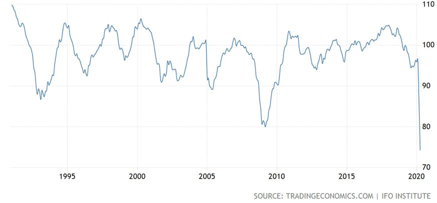 Fredag blev der offentliggjort tal, der viser at det tyske IFO-tillidsindeks faldt fra 86,1 i marts til 74,3 i april. Det er det laveste niveau, der er registreret siden den tyske genforening. Vi har dertil aldrig tidligere set et så kraftigt fald i IFO-indekset som i marts og april. De seneste måneders voldsomme fald i IFO-indekset viser med al tydelighed, at tysk økonomi befinder sig i en historisk choktilstand.