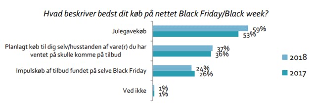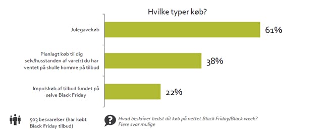 Det bekræftes af Black Friday analysen, som viser, at forbrugerne er strukturerede i deres indkøb. Knap to tredjedele af forbrugerne gør deres julegaveindkøb på Black Friday, mens lidt under halvdelen havde planlagt at købe deres varer, når udsalget trådte i kraft. Kun en femtedel lavede impulskøb på selve dagen.