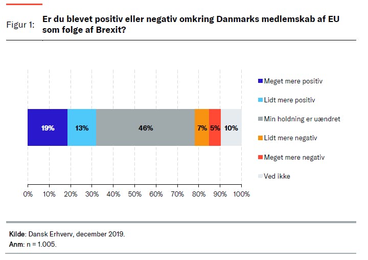 Analysen viser tydeligt, at danskerne er blevet mere positive omkring Danmarks med-lemskab af EU som følge af Brexit. 32 pct. af danskerne er blevet mere positive, mens 12 pct. af blevet mere negative. Samlet set er EU-optimismen altså vokset markant som følge af Brexit.