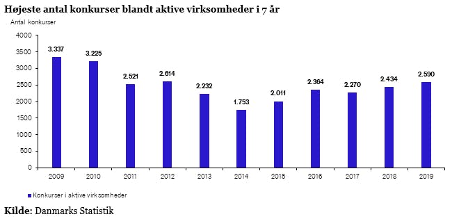 Når man sorterer de ikke aktive virksomheder fra, så er billedet lidt bedre. I 2019 har 2.590 virksomheder med aktiviteter måtte dreje nøglen om som følge af konkurs. Det er det højeste antal konkurser i 7 år. Vi skal tilbage efterdønning fra finanskrisen før vi sidst havde så mange virksomheder, der måtte dreje nøglen om. Set i lyset af den flotte vækst, der har været i dansk og international økonomi, er det overraskende, at mange virksomheder går konkurs. En del af forklaringen er, at når tiderne er gode, er der mange med en iværksætter gemt i maven, som får mod på at starte egen virksomhed. Det har vi også set i Danmark, hvor der aldrig er blevet etableret så mange nye virksomheder, som vi har set de seneste år.