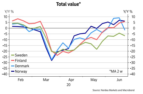 Udviklingen er baseret på kortbetalinger gennem Nordea, hvor man har sammenlignet med samme periode året før. Overordnet konkluderer Nordea, at forbruget nærmer sig normaltilstand efter store dyk i marts og april måned.
