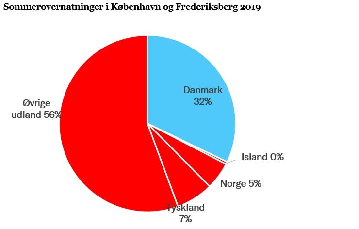 - Milliarder i mistet udenlandsk omsætning: Sommer 2020 bliver helt uden overnattende udenlandske gæster. Stort tab i sigte, da udenlandske turister i København årligt forbruger for 24,5 mia. kr. – eller 45 pct. af det samlede udenlandske forbrug i hele Danmark på 55 mia. kr.