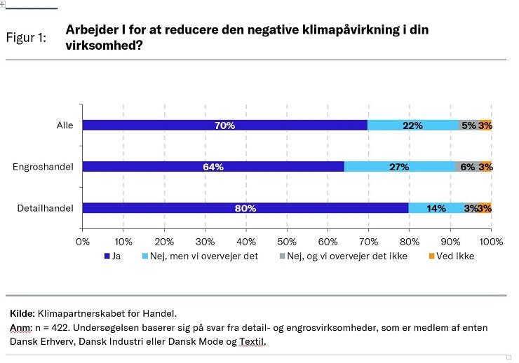Hele 70 procent af alle handelsvirksomheder i Dansk Erhverv, DI Handel og DM&T arbejder for at reducere den negative klimapåvirkning. Særligt detailhandlen yder et stort bidrag, hvor 80 procent af virksomhederne svarer, at man arbejder for at reducere klimapåvirkningen.