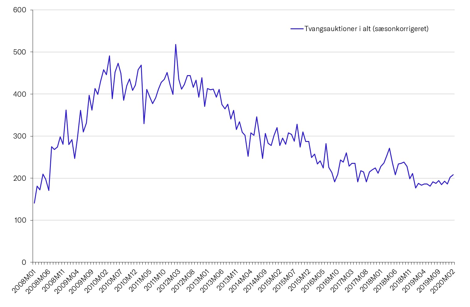 Offentliggjorte tal fra Danmarks Statistik torsdag viser, at antallet af tvangsauktioner lå på 208 i februar. Det er en mindre stigning sammenlignet med januar. Det er samtidig anden måned i træk, hvor vi ser flere tvangsauktioner.