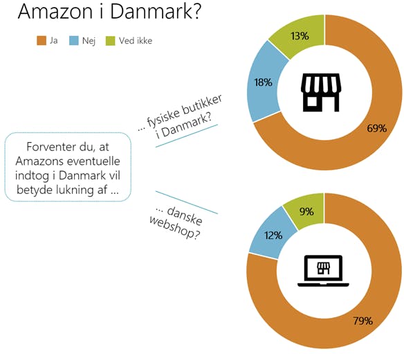 I en ny undersøgelse svarer 79 % af virksomhederne, at de forventer, at Amazons indtog i Danmark vil føre til lukkede netbutikker, mens 69 % forventer lukkede fysiske butikker.
