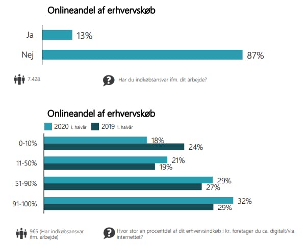13% af de e-handlende forbrugere har et erhvervsmæssigt indkøbsansvar. Det svarer til 22% af de erhvervsaktive forbrugere. Af disse 13% erhvervsindkøbere, handler 6 ud af 10 (61%) mindst halvdelen af deres erhvervsindkøb digitalt.