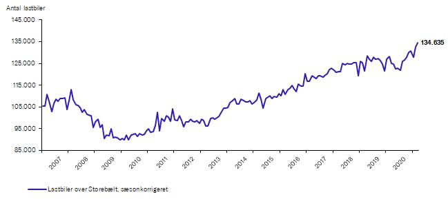 Siden august sidste år har der med en enkelt undtagelse været en stigning i månedstallet af lastbiler, der passerer Storebæltsbroen. Der har generelt været høj aktivitet i vejgodstransportbranchen under corona-krisen, hvor folks ændrede adfærd og indkøbsvaner ikke har påvirket vejgodstransporten i negativ retning.