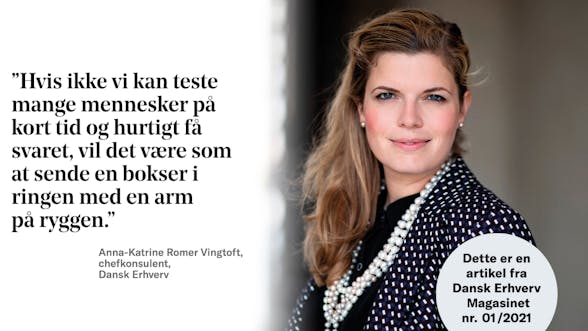 Her er hurtigtest eller antigentest i Dansk Erhvervs optik en vigtig nøgle som et supplement til den offentlige teststrategi, der alene bygger på PCR-tests. For selvom PCR-testen er guldstandarden inden for test, så er den omkostningstung og tidskrævende at gennemføre. Derimod giver en hurtigtest svar – ja, hurtigt. På cirka et kvarter og til en helt anden kostpris kan danskere vide, om de risikerer at smitte andre. Af de grunde kæmpede Dansk Erhverv for, at hurtigtestene blev taget i anvendelse i december.