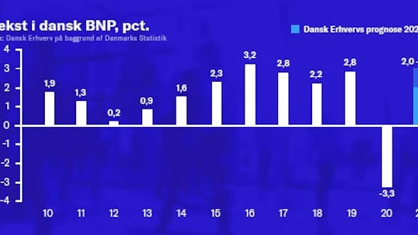 Efter en hård vinter med negativ vækst i første kvartal er det Dansk Erhvervs forventning, at Danmark kommer til at se en rekyl i væksten hen over foråret i takt med at smitten aftager, og vaccinerne rulles bredt ud i befolkningen. Som tingene ser ud nu, er det bestemt ikke utænkeligt, at vi får en positiv BNP-vækst på to til tre procent i år.