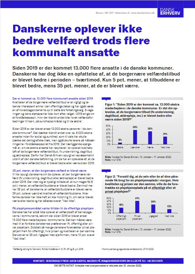 Siden 2019 er der kommet 13.000 flere ansatte i de danske kommuner. Danskerne har dog ikke en opfattelse af, at de borgernære velfærdstilbud er blevet bedre i perioden – tværtimod. Kun 5 pct. mener, at tilbuddene er blevet bedre, mens 35 pct. mener, at de er blevet værre.